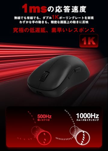 特に無線モード時でも1msの応答速度と1kHzのポーリングレートを実現し、有線接続時と遜色ない低遅延を担保。