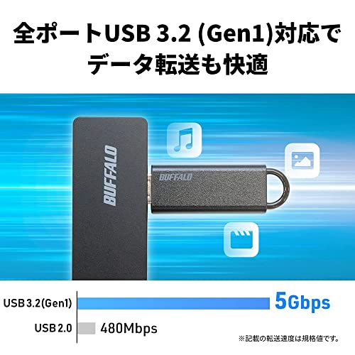 バッファローのこのモデルはバスパワー駆動で、コンセントが不要で使いやすい一方、電力消費が高いUSB機器を複数同時に接続する場合は注意が必要です。