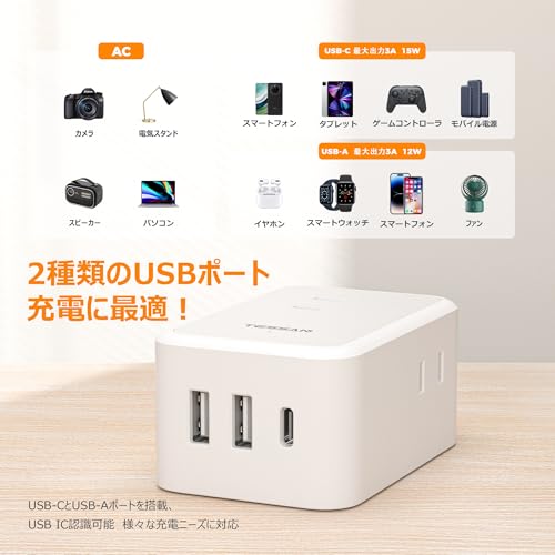 TESSAN電源タップは正面・左右に分散した3口ACコンセントに加え、USB-A2口とType-C1口を搭載。