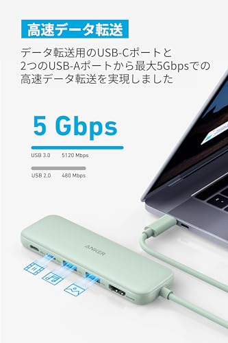 Anker 332 USB-Cハブは、USB-Cポート1つから5つのポートを拡張可能。高速データ転送(USB 3.2 Gen1対応、最大5Gbps)で外付け機器やUSBメモリとのやり取りもストレスがありません。