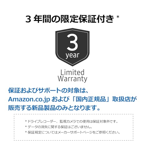 また、3年限定保証がついていますが、ドライブレコーダーや監視カメラでの使用は保証対象外である点も押さえておきましょう。