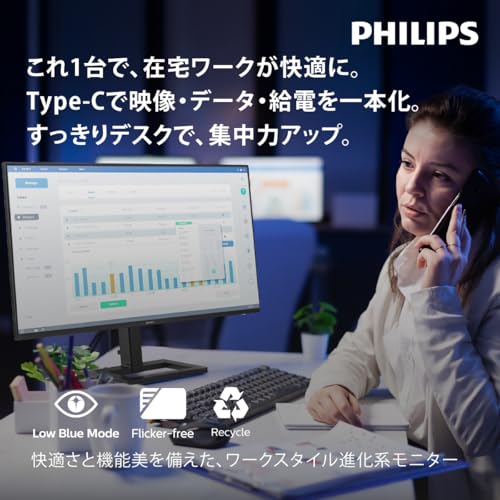 PHILIPS 24E1N2300AEなら、USB Type-Cケーブル一本で映像出力と電力供給を両立し、デスクの配線負担を劇的に軽減します。