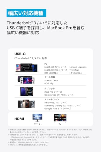 実際、Thunderbolt 3/4/5規格に対応しているため、対応するMacBook Proや最新のiPad Pro、Galaxyなど、幅広い機器で安定した映像と充電性能を発揮する点が魅力です。
