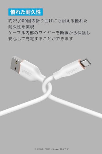 AnkerのこのUSBケーブルは、約25,000回の折り曲げに耐える耐久性を備えており、日常使用でありがちな断線リスクを大幅に軽減しています。